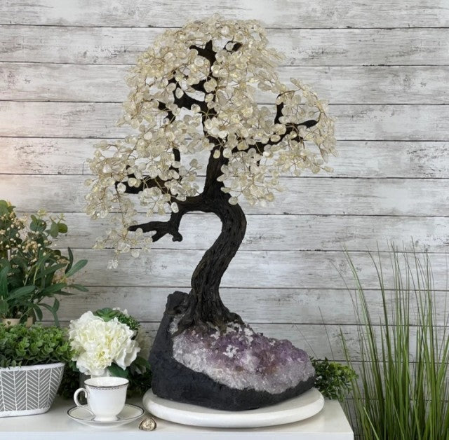 Special Clear Quartz Gemstone tree, handmade in Brazil with an amazing Amethyst cluster base.