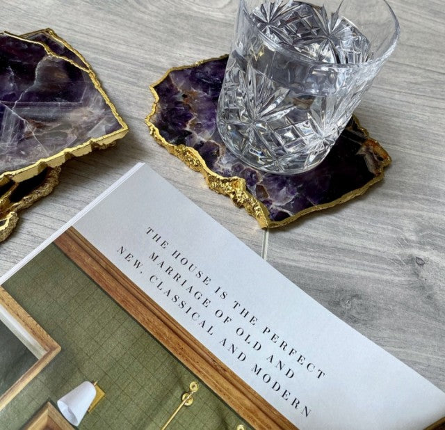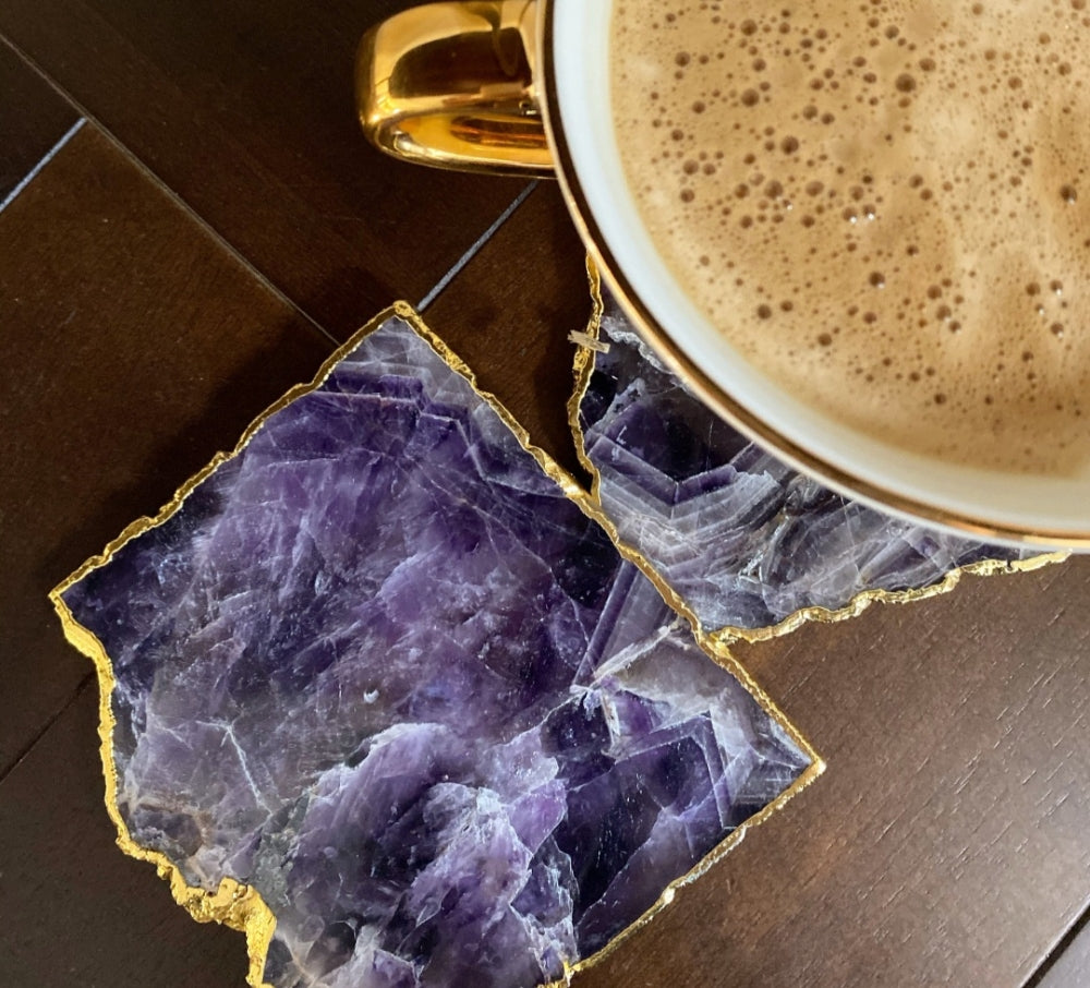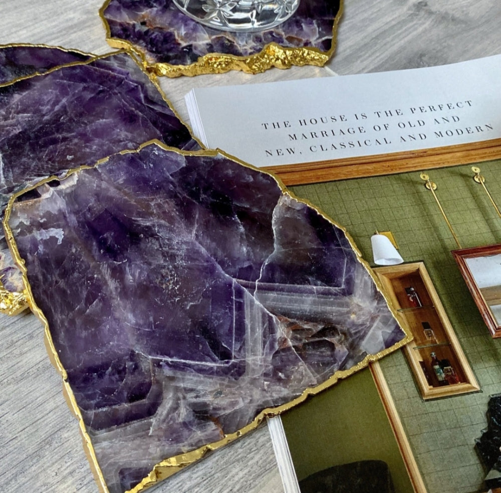 Ametyst Coaster skiver med gullbelagte kant, 10mm tykk kant, stk. pris