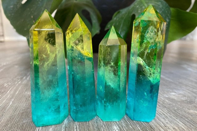 Aurakvarts Tårnkrystall , Gul/GrønnLarge 5 - 6 cm