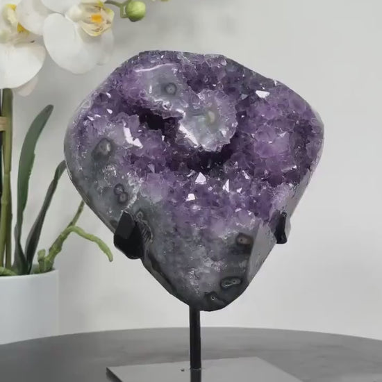 Elevate the ambiance of your home or office with the captivating beauty of our Amethyst Specimens. Nestled elegantly on a modern metal display, this stunning piece blends natural elegance with contemporary style, making it a perfect addition to any decor.
