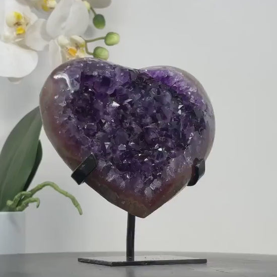 Discover the beauty of our hand-polished heart-shaped minerals, sourced from Uruguay, including Amethysts, Agates, and Quartz. Each piece is meticulously crafted and comes with a custom-made metal stand, adding a touch of elegance to any space.