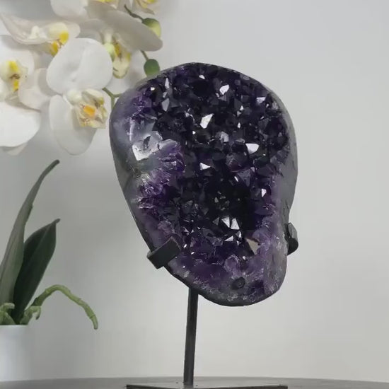 Elevate the ambiance of your home or office with the captivating beauty of our Amethyst Specimens. Nestled elegantly on a modern metal display, this stunning piece blends natural elegance with contemporary style, making it a perfect addition to any decor.