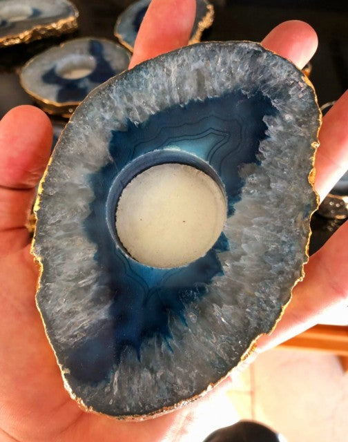 Brazilian Blue Agat Coaster Telys dekorasjon Gold Electroplated, LARGE