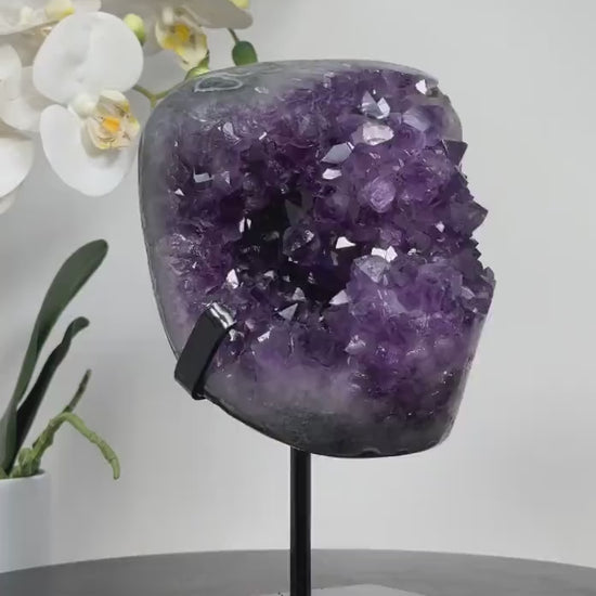 Elevate the ambiance of your home or office with the captivating beauty of our Amethyst Specimens. Nestled elegantly on a modern metal display, this stunning piece blends natural elegance with contemporary style, making it a perfect addition to any decor.