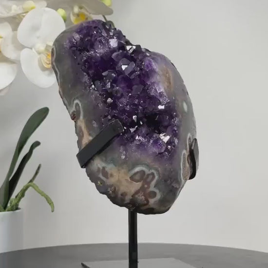 Elevate the ambiance of your home or office with the captivating beauty of our Amethyst Specimens. Nestled elegantly on a modern metal display, this stunning piece blends natural elegance with contemporary style, making it a perfect addition to any decor.