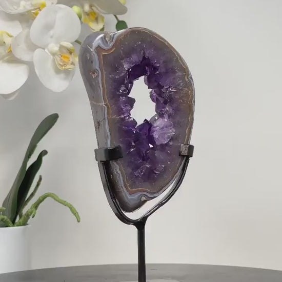Explore the enchanting world of Uruguay's finest minerals with our unique collection of hand-polished specimens. Each piece is meticulously crafted and accompanied by a custom-made metal stand, enhancing its natural beauty and elegance.