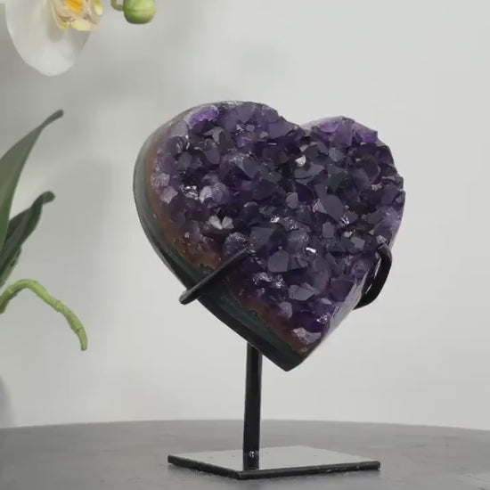 Discover the beauty of our hand-polished heart-shaped minerals, sourced from Uruguay, including Amethysts, Agates, and Quartz. Each piece is meticulously crafted and comes with a custom-made metal stand, adding a touch of elegance to any space.