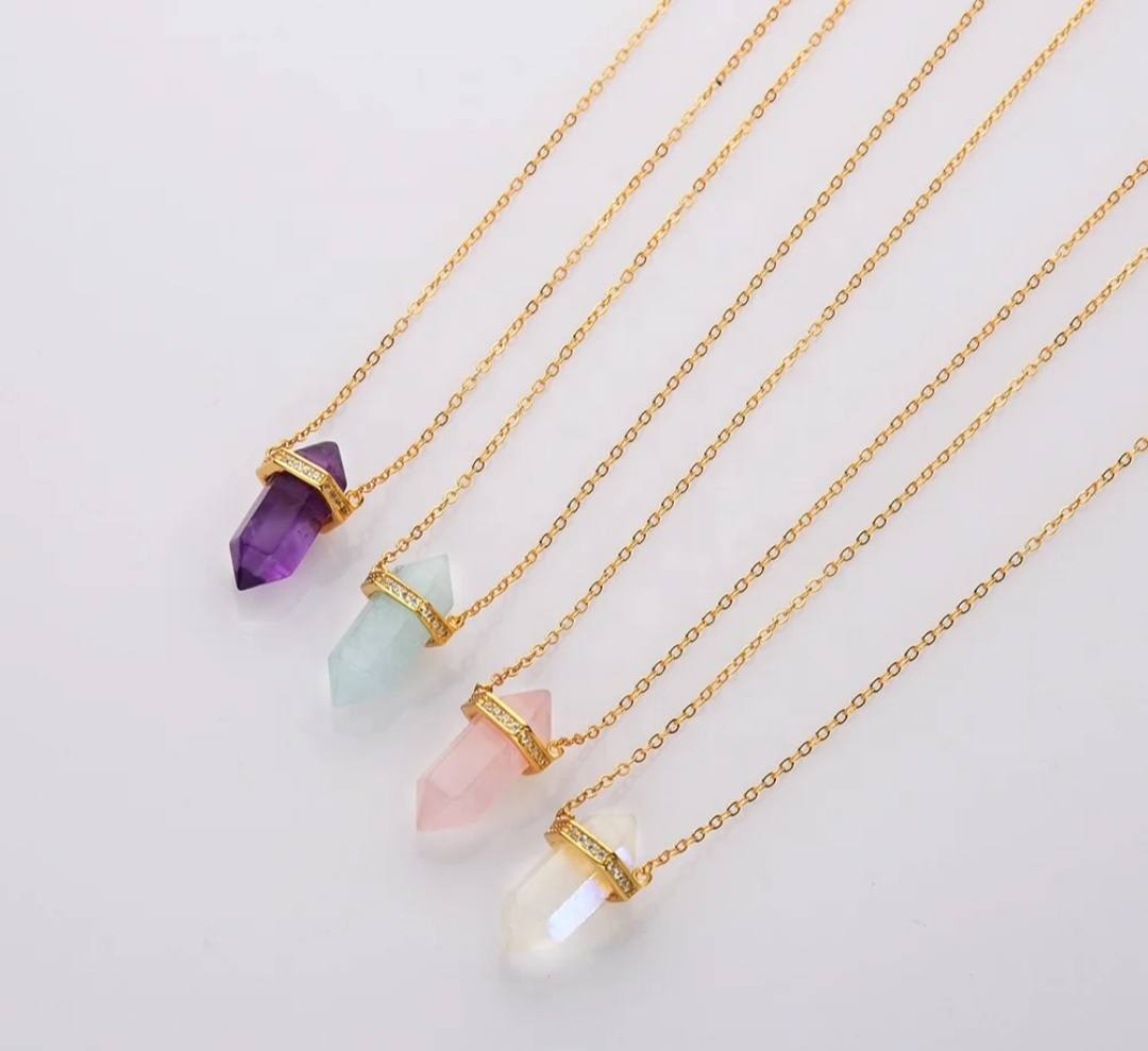 Smykkesettene leveres i 4 populære stentyper, 8x10mm oval ringsten og 18x6mm dobbelterminert pointanheng ( Ametyst, Rose Quartz, Moonstone, Aquamarine ).