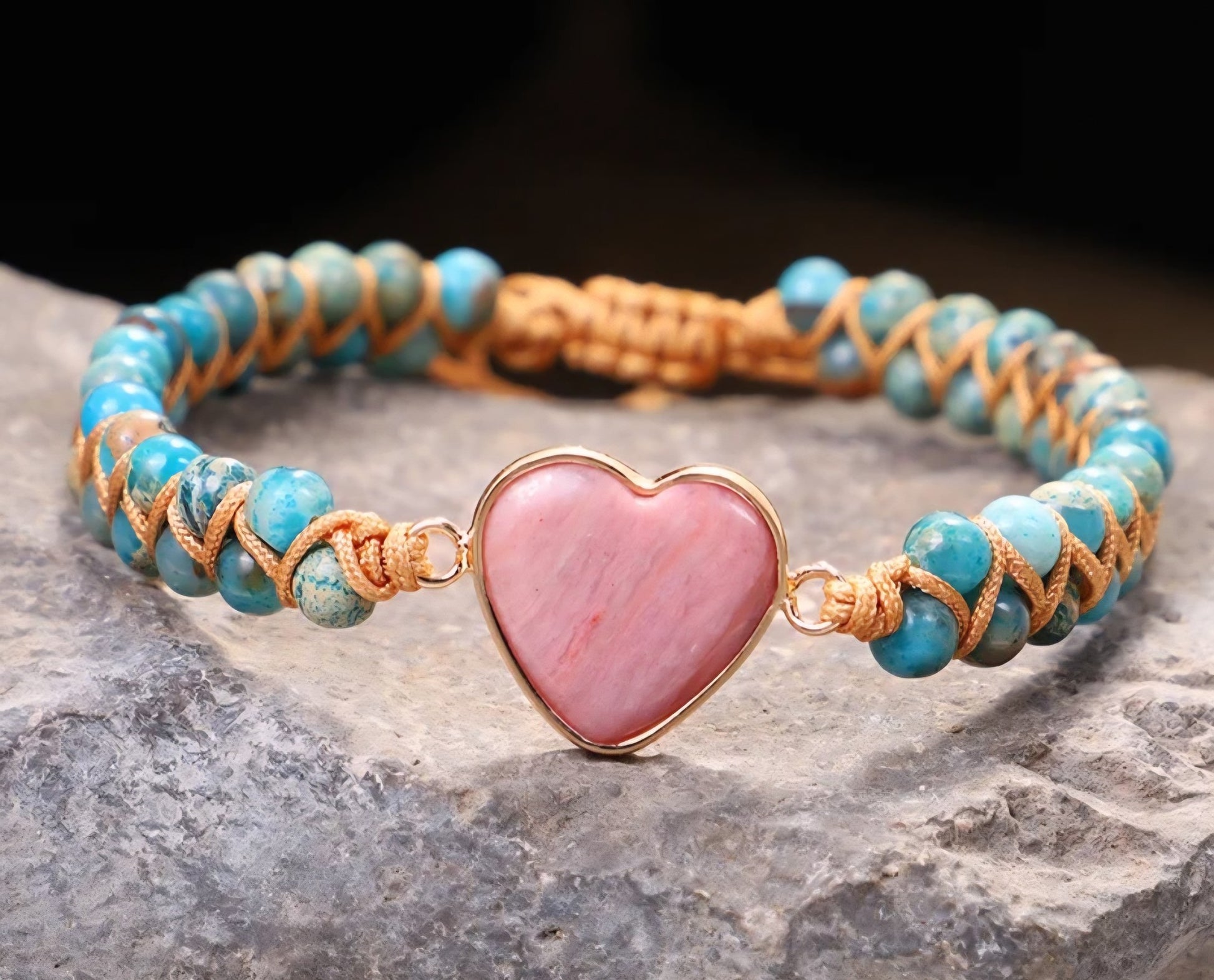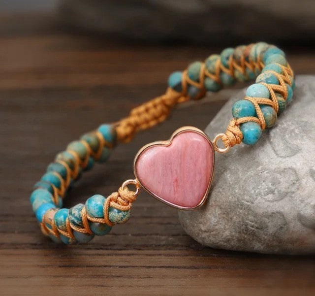 Enkle og vakre Chambhala 2 rader armbÅnd m/ Hjerteformet Rhodocrosite sten og smÅ turkise stener ( justerbart )