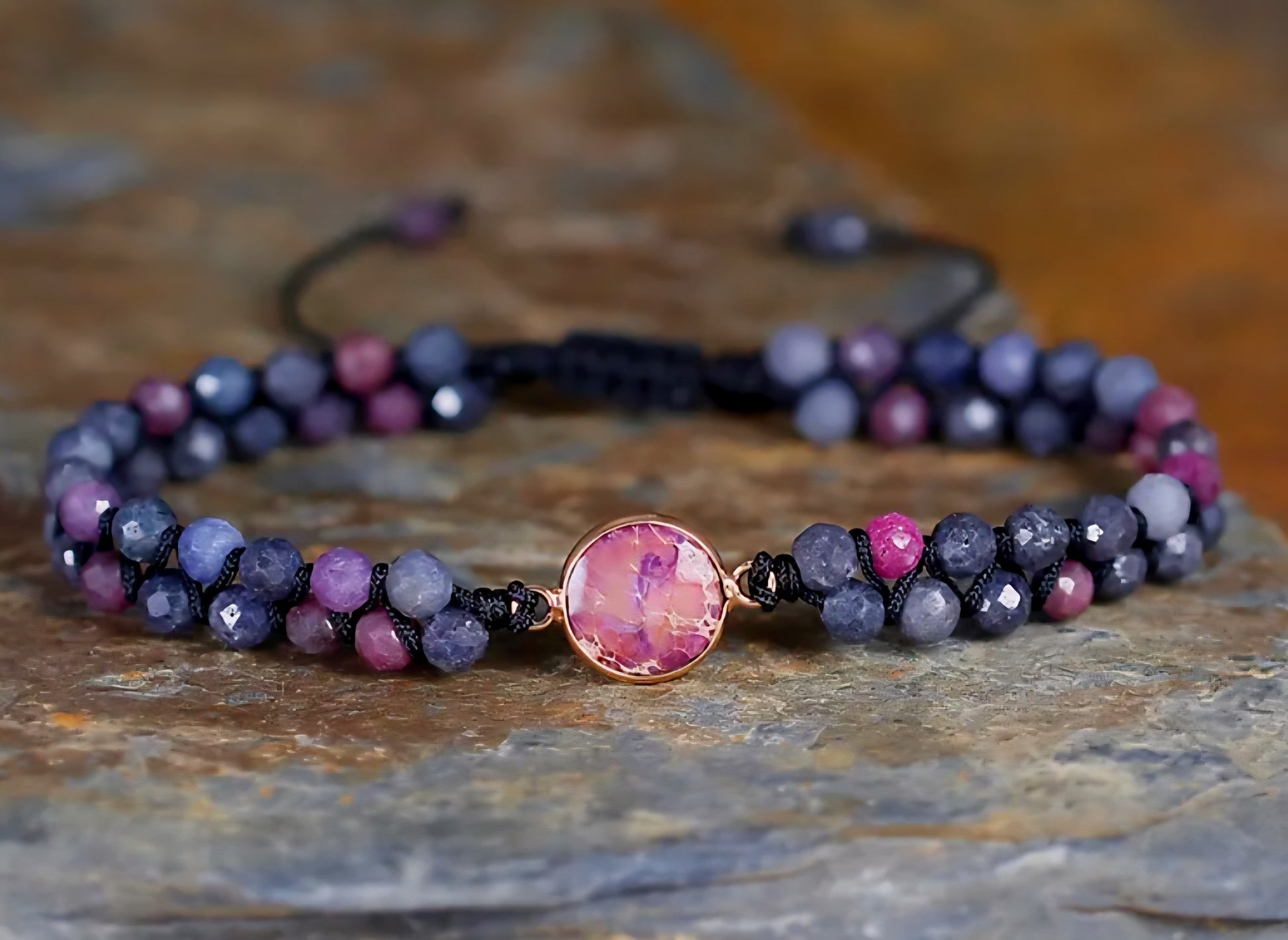 Enkle og vakre Chambhala 2 rader armbånd m/ Ruby & Sapphire sten og små tilsvarende stener ( justerbart )