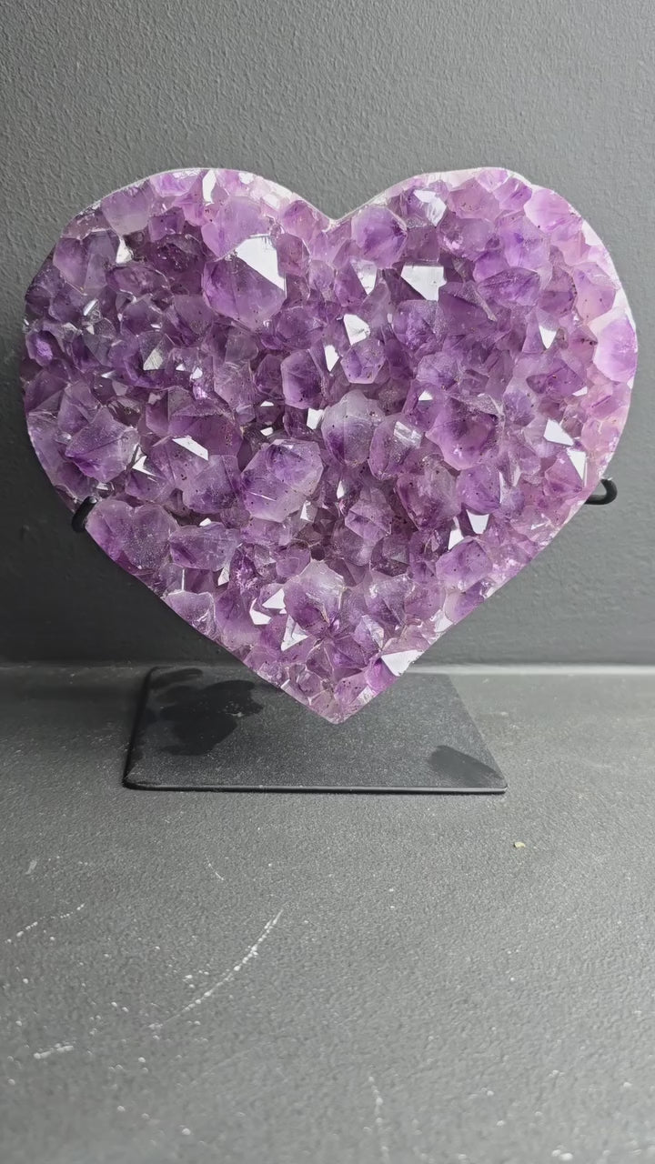 Experience the captivating beauty of this Extra Quality Heart-Shaped Amethyst Geode by Brazil Gems. Elegantly displayed on a sleek black metal stand, this stunning gemstone showcases polished edges that highlight its vibrant violet hues, while the natural rough stone on the backside adds a touch of raw authenticity. Each crystal point sparkles with the unique, untouched beauty crafted by Mother Nature herself. Artisans in South Brazil mastered the technique to make heart-shaped gemstones, a very labor-intensive task that requires a lot of skill and precision. The result is a beautiful piece that will certainly look great in your home or office or make a long lasting gift to a loved one
