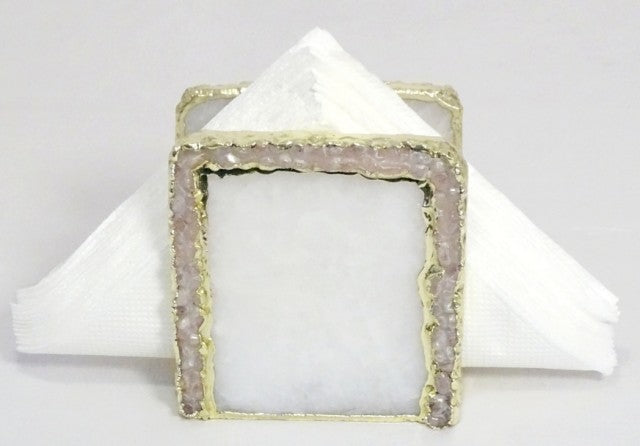 Håndlagede 12mm Hvit AGAT m/Rose Quartz Decor serviettholder med gullbelagt kant ( Gold Electroplated ), ca. 20 servietter