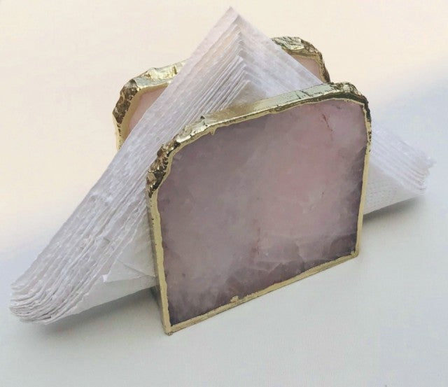 Håndlagede 12mm ROSENKVARTS serviettholder med gullbelagt kant ( Gold Electroplated ), rommer ca. 20 servietter