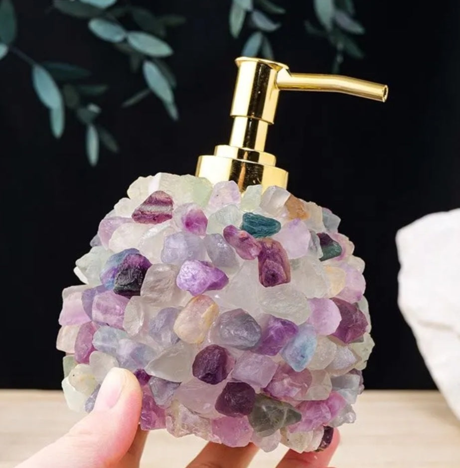Håndlaget Såpedispenser i Rå Fluorite Quartz - ca 13x10cm