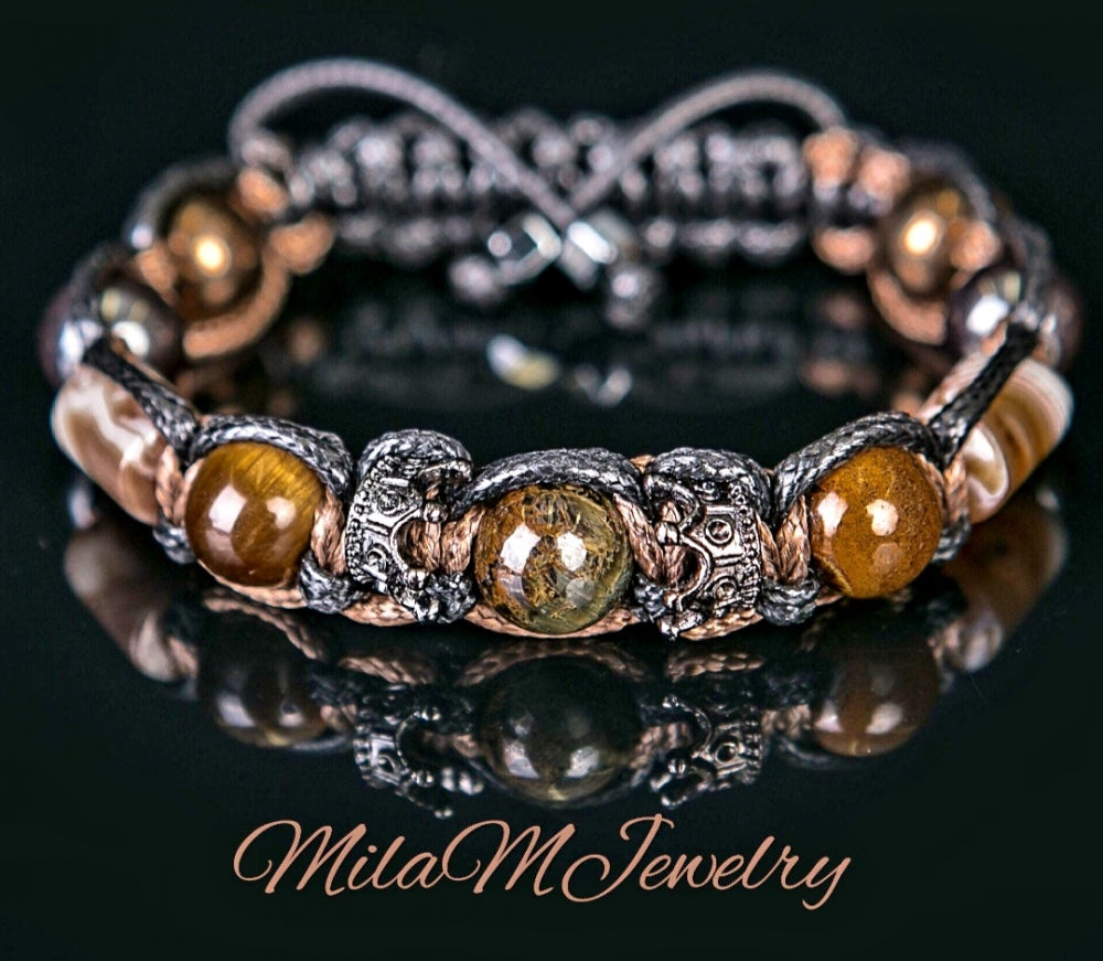Superlekkert armbånd fra kunstneren Mila i Kyiv Ukraina.. Håndlaget og designet med Botswana Agat, Tigerøye og Hematitt.. Unisex size, leveres i justerbar størrelse for både han og henne i waxed cord. High Quality Handcraft !