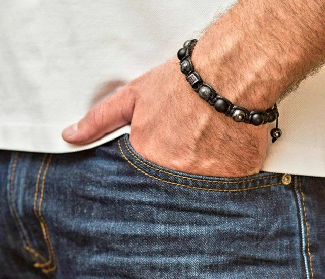 Trendy og Exclusivt Shambhala Armbånd , Larvikitt ( Black Moonstone), Hematitt og Sort Onyx , unisex og justerbare