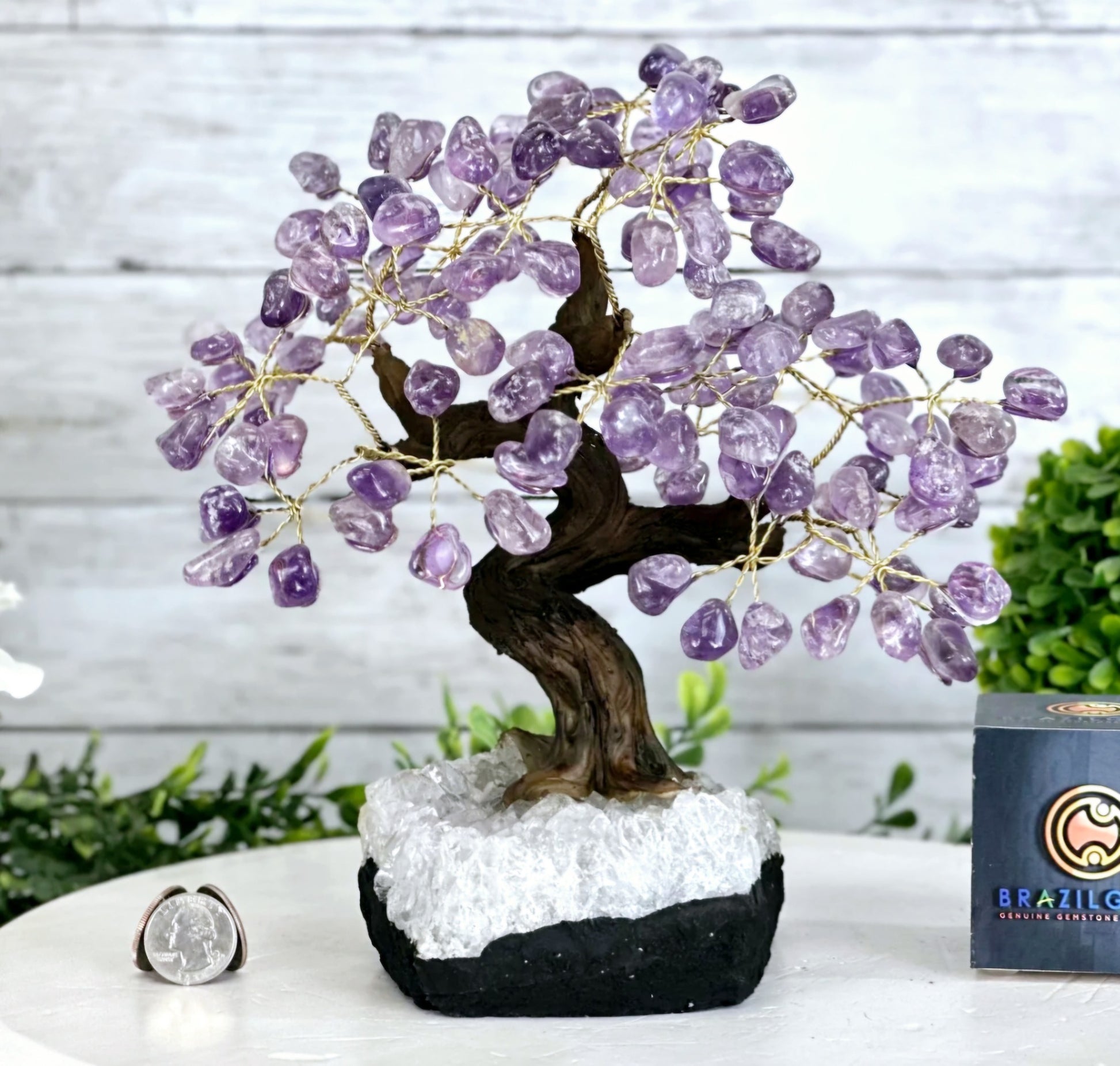 Supervakre og eksklusive, Feng Shui - Bonsai Krystalltrær med håndlaget solid stamme, stor Ametyst / Quartz Cluster fotstøtte og gulltråd på grener. Håndlaget i Brasil - One of a kind !