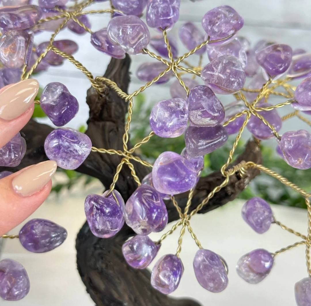 The Amethyst base is then shaped to be flat on the bottom and nicely formed all around. A variety of polished natural tumbled gemstones are then selected and glued onto the wire branches. Each tree size has an exact number of branches with the exact number of gemstones so they balance to give the correct look to the tree according to its size.