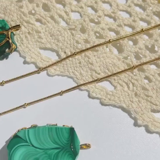 This Raw Malachite Pendant Gold Necklace is a stunning piece of jewelry that showcases the natural beauty of malachite, a gemstone associated with May birthdays. The raw and rough-cut malachite pendant is complemented by a delicate gold chain, creating a beautiful contrast between the rugged stone and the elegant metal.