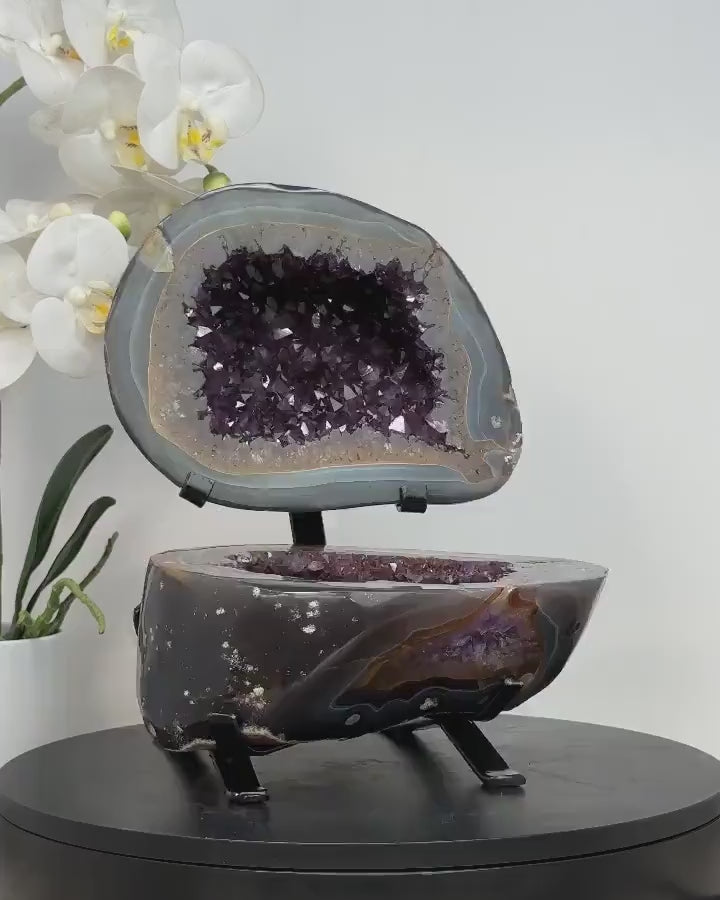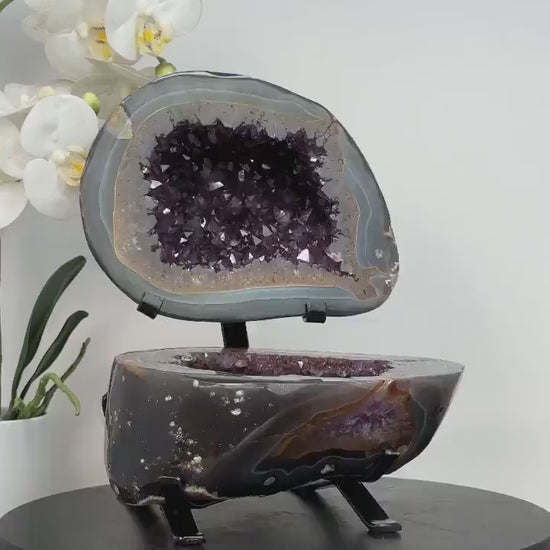 MÅNEDENS UTVALGTE / Beautiful Uruguay Blue Banded Agate & Amethyst Geode inkl. stativ - 6kg - 26.5Hx20Bx13.5cm