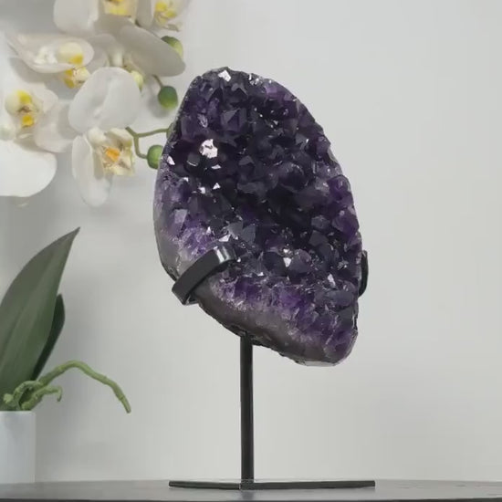 Elevate the ambiance of your home or office with the captivating beauty of our Amethyst Specimens. Nestled elegantly on a modern metal display, this stunning piece blends natural elegance with contemporary style, making it a perfect addition to any decor.