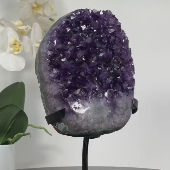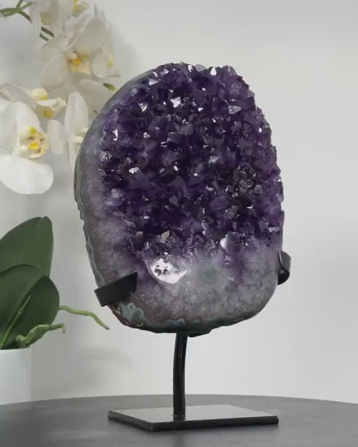 Elevate the ambiance of your home or office with the captivating beauty of our Amethyst Specimens. Nestled elegantly on a modern metal display, this stunning piece blends natural elegance with contemporary style, making it a perfect addition to any decor.