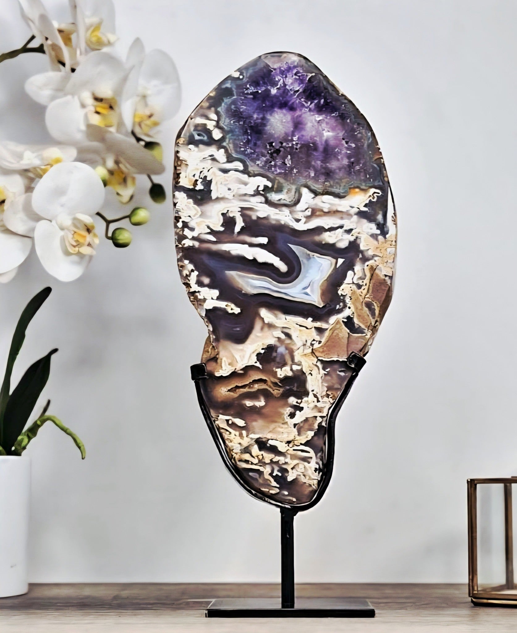 Explore the enchanting world of Uruguay's finest minerals with our unique collection of hand-polished specimens. Each piece is meticulously crafted and accompanied by a custom-made metal stand, enhancing its natural beauty and elegance.