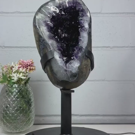Elevate the ambiance of your home or office with the captivating beauty of our Amethyst Specimens. Nestled elegantly on a modern metal display, this stunning piece blends natural elegance with contemporary style, making it a perfect addition to any decor.