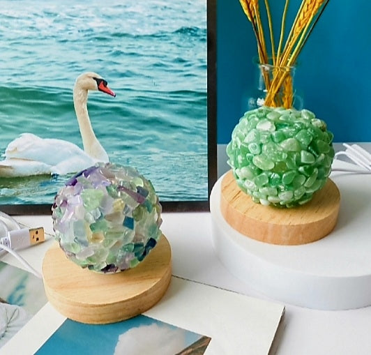 Ny grønn Aventurine Sphere Ledlampe med trebase og usb, ca. 9-10cm