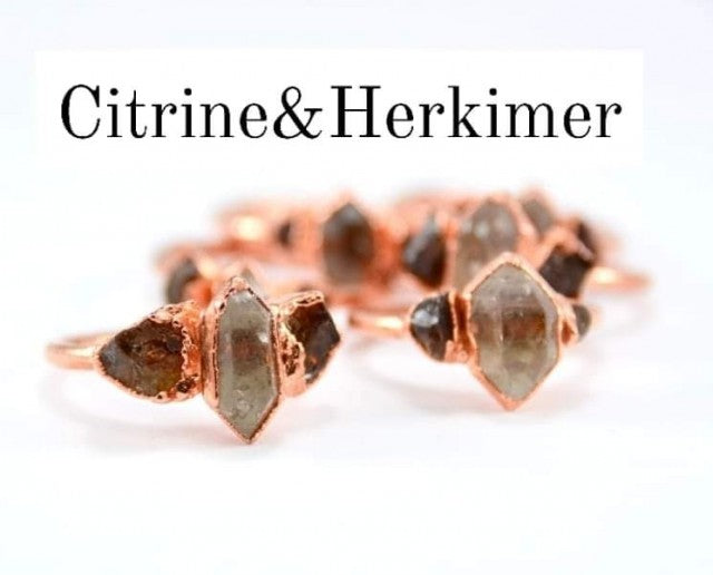 Ny, hÅndlaget rustik Art Deco Triple Stone Citrine & Herkimer Diamond Electroplated ROSE Copper Ring