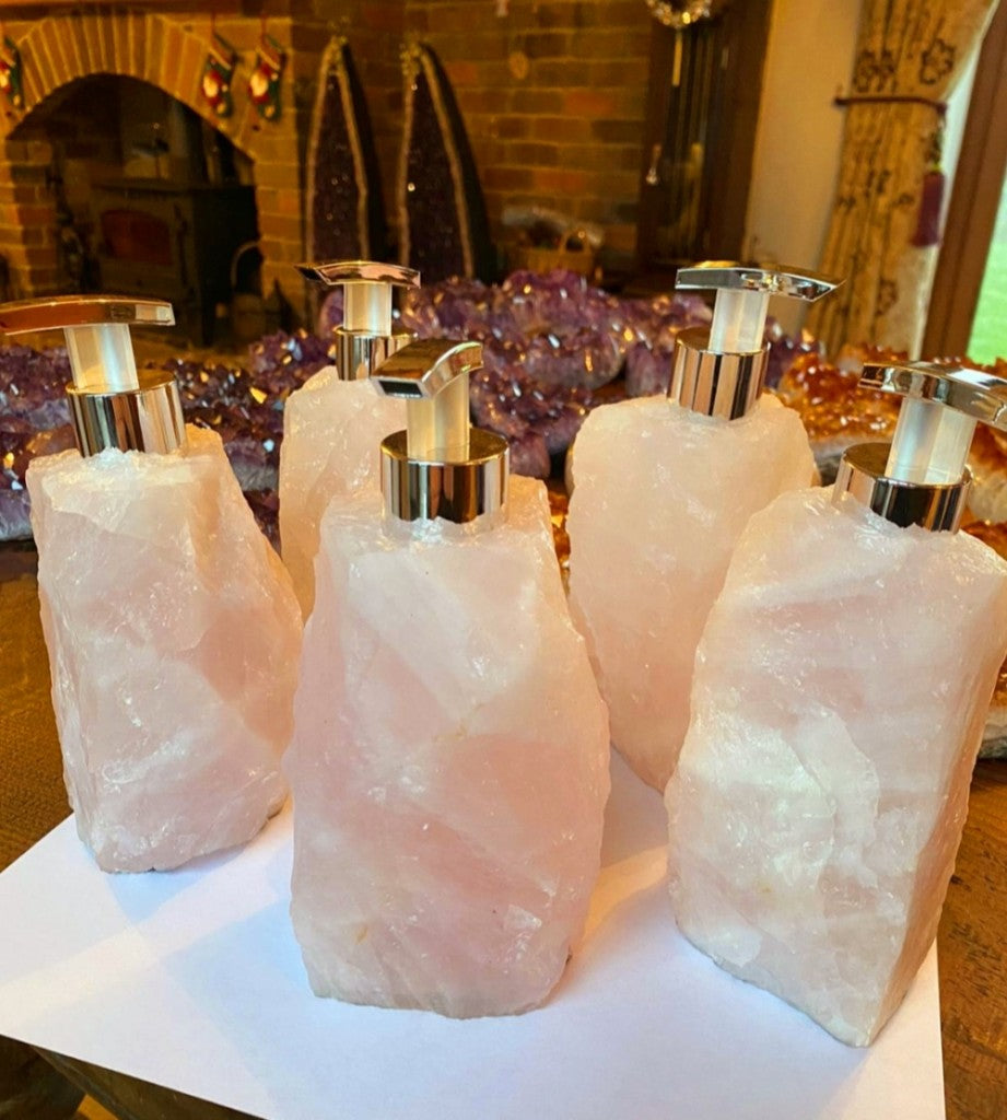 Nye, eksklusive - handcarved XL Raw Rose Quartz Såpedispenser for bad og kjøkken, 18x10cm - 1.6kg