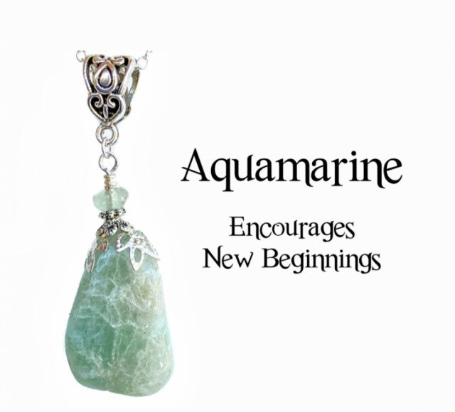 Nye, håndlagede råkrystall kjeder med Quamarine anheng..Leveres med 60cm lengde.