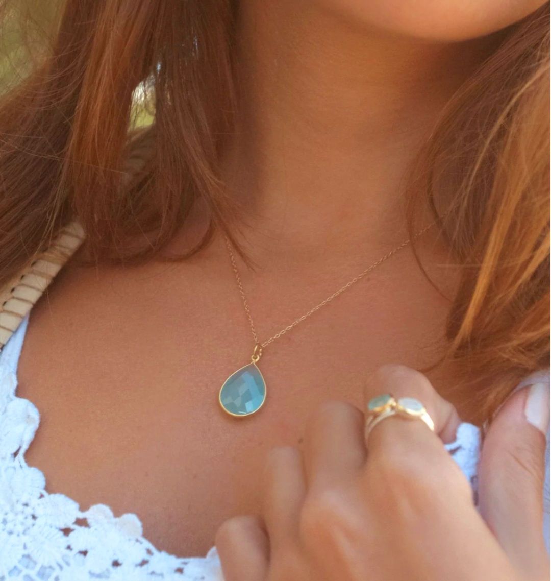 Nytt og enkelt Cila Designkjede med Aqua Blue Chalsedony Tear Drop Anheng,18 K Gold Vermeil