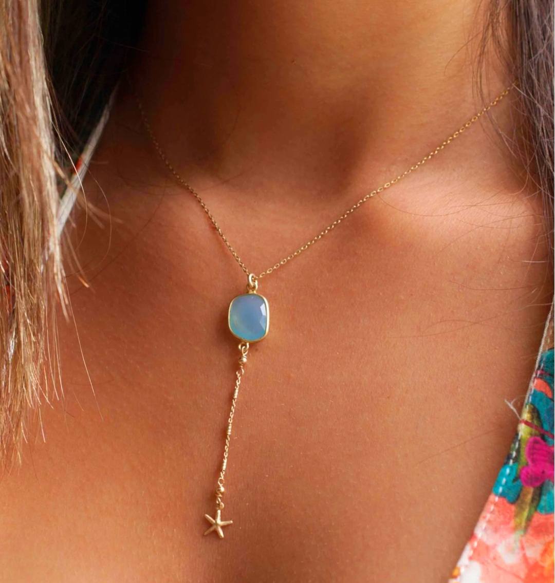 Nytt og enkelt Cila Designkjede med Aqua Blue Chalsedony w/Sea Star, 18 K Gold Vermeil