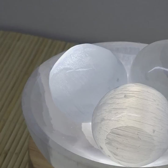 Selenite Lamp / Energy Clearing Bowl with Spheres & LED Base m/Lysjustering