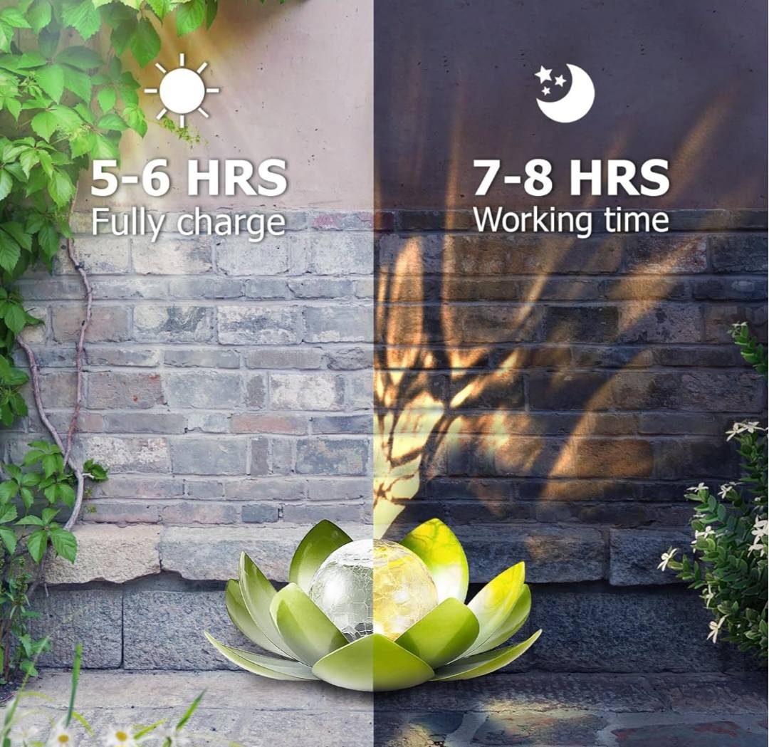 - Solar Powered Illumination: Our lotus flower outdoor lights harness solar power, charging during the day and automatically lighting up at night for up to 8 hours. The solar panel is thoughtfully placed at the bottom of the transparent cracked glass bulb for maximum exposure.