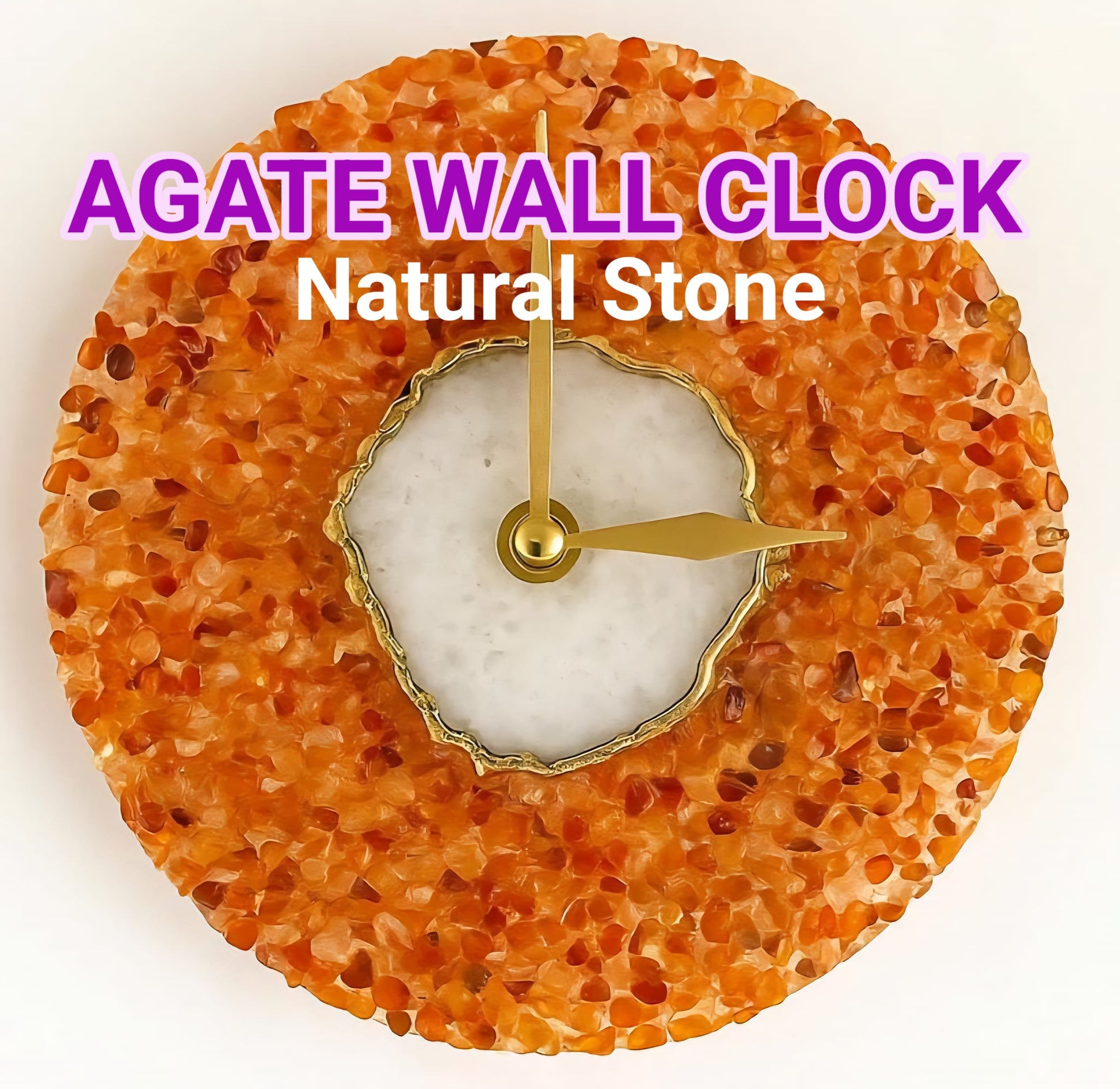 Vakker håndlaget Agat klokke med Karneol og gulldecor, ( gold electroplated ) , 25cm m/ quartz ur. Veggoppheng og stand inkludert.