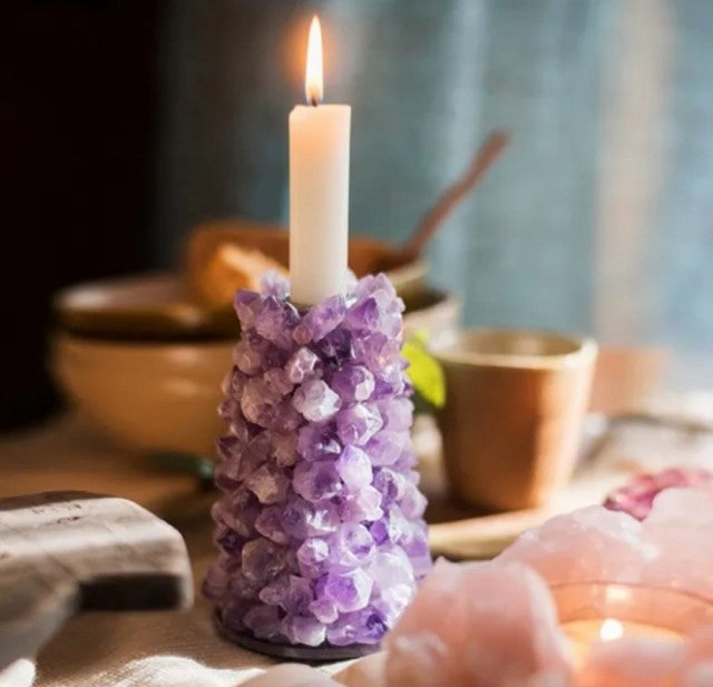 Stor og Superflott Ametyst lysestake ( for høye lys ) i råkvarts, ca. 13cm / 500gram