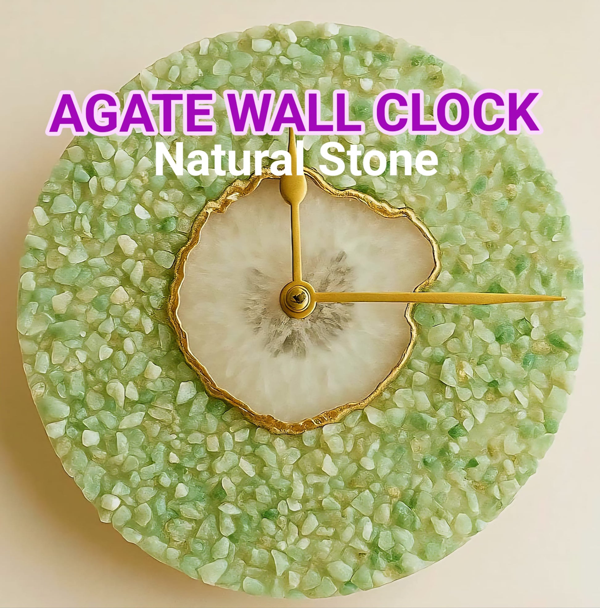 Stor og vakker håndlaget Agat klokke med grønn Aventurin og gulldecor (gold electroplated ) , 25cm m/ quartz ur. Veggoppheng inkludert.