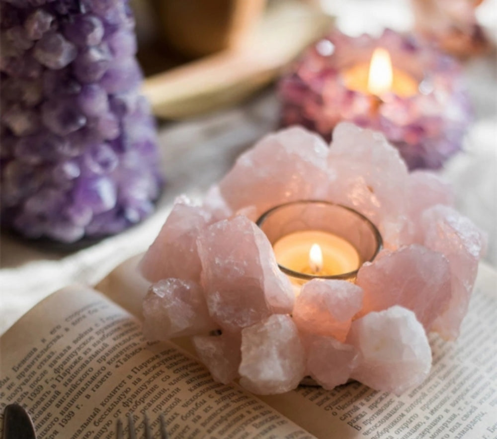 Stor Rosenkvarts RÅ Kvarts Krystalldekorasjon m/glass innvendig til Telys, Large 13 - 15cm, 500 gram
