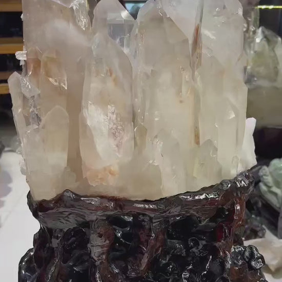 Stort og unikt XXL Brazilian White Quartz Tower Cluster, ca. 26Kg inkl. dekorativ, håndlaget trebase