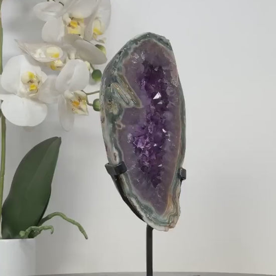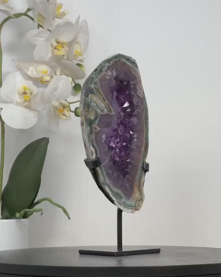 Elevate the ambiance of your home or office with the captivating beauty of our Amethyst Specimens. Nestled elegantly on a modern metal display, this stunning piece blends natural elegance with contemporary style, making it a perfect addition to any decor.
