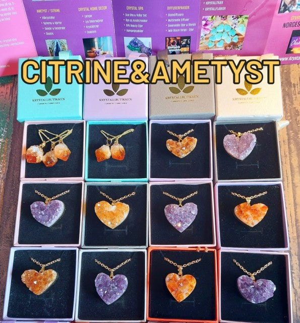 Supervakre og store - 40mm druzy Raw Ametyst & Citrine Cluster Hjerteanheng m/80cm langt kjede, Gold Electroplated