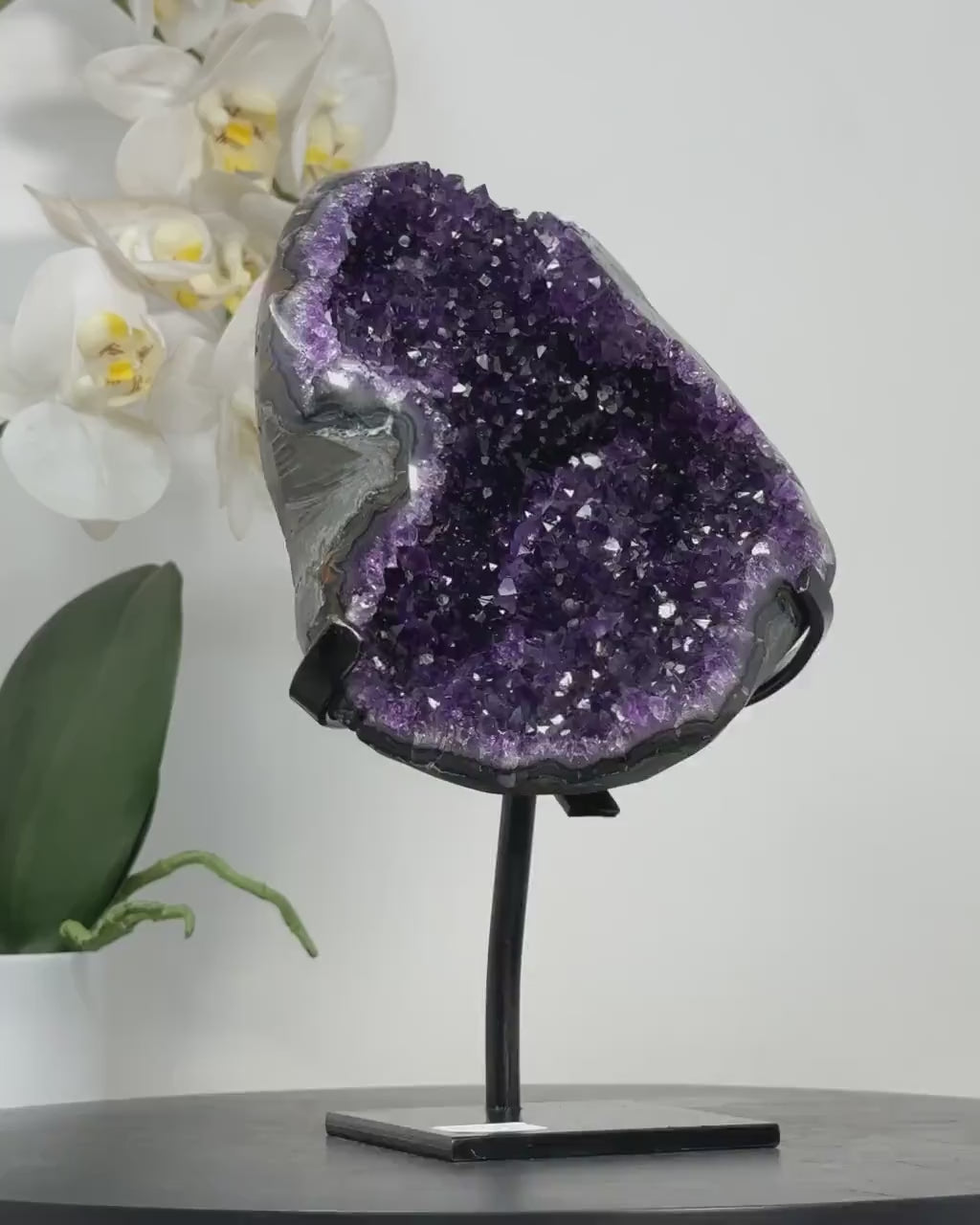 Elevate the ambiance of your home or office with the captivating beauty of our Amethyst Specimens. Nestled elegantly on a modern metal display, this stunning piece blends natural elegance with contemporary style, making it a perfect addition to any decor.