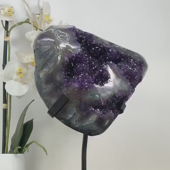 Elevate the ambiance of your home or office with the captivating beauty of our Amethyst Specimens. Nestled elegantly on a modern metal display, this stunning piece blends natural elegance with contemporary style, making it a perfect addition to any decor.