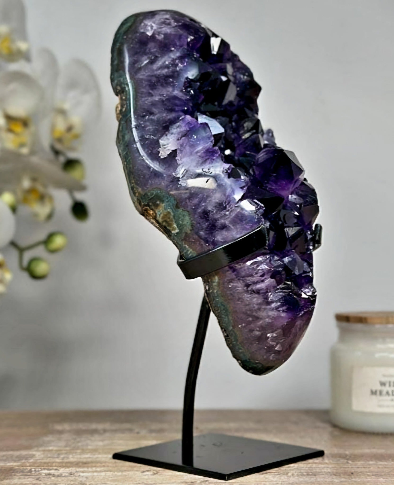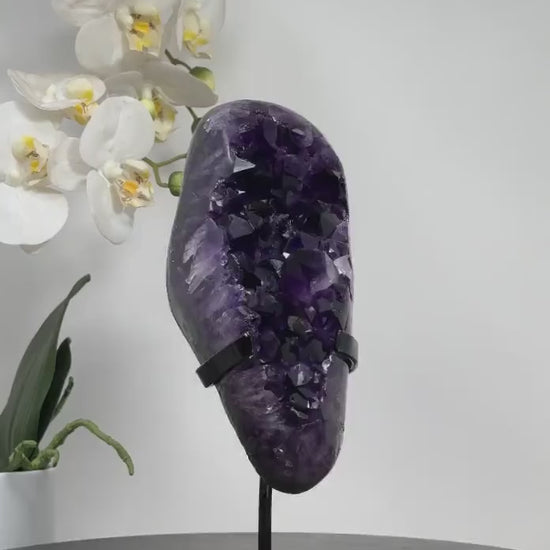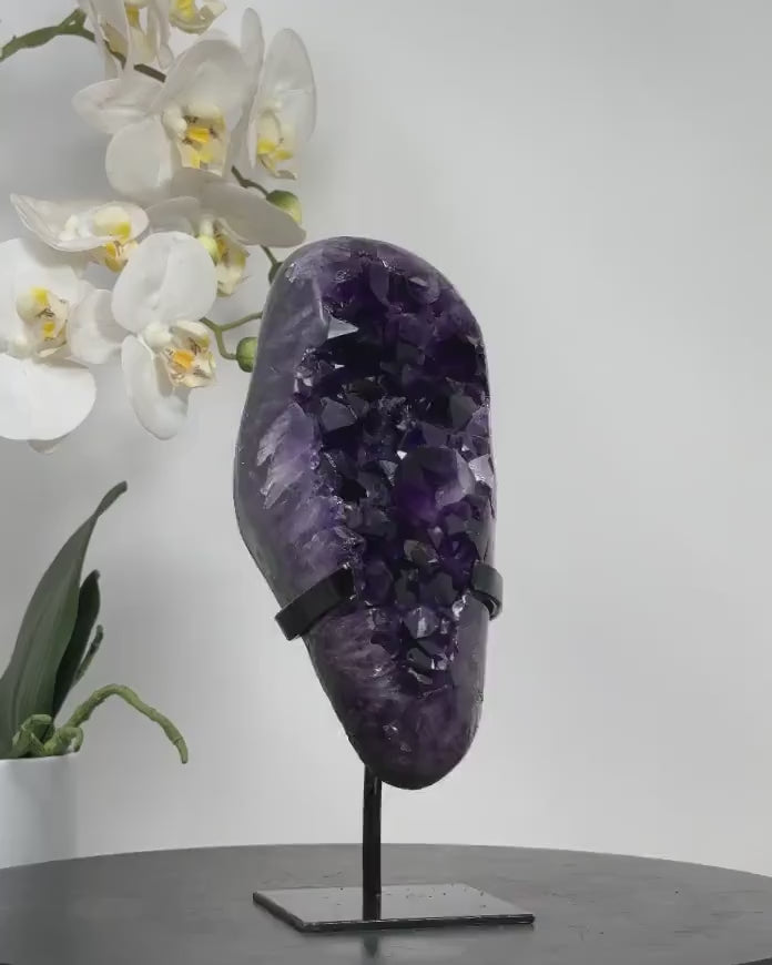 Elevate the ambiance of your home or office with the captivating beauty of our Amethyst Specimens. Nestled elegantly on a modern metal display, this stunning piece blends natural elegance with contemporary style, making it a perfect addition to any decor.