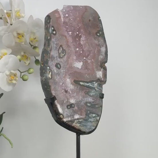 Large Pink Ametyst Quartz & Agata Stone Slice, Decorative Portal, Custom Metal Stand, MWS2328 - 32x15cm
