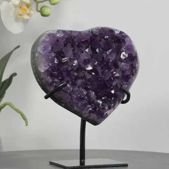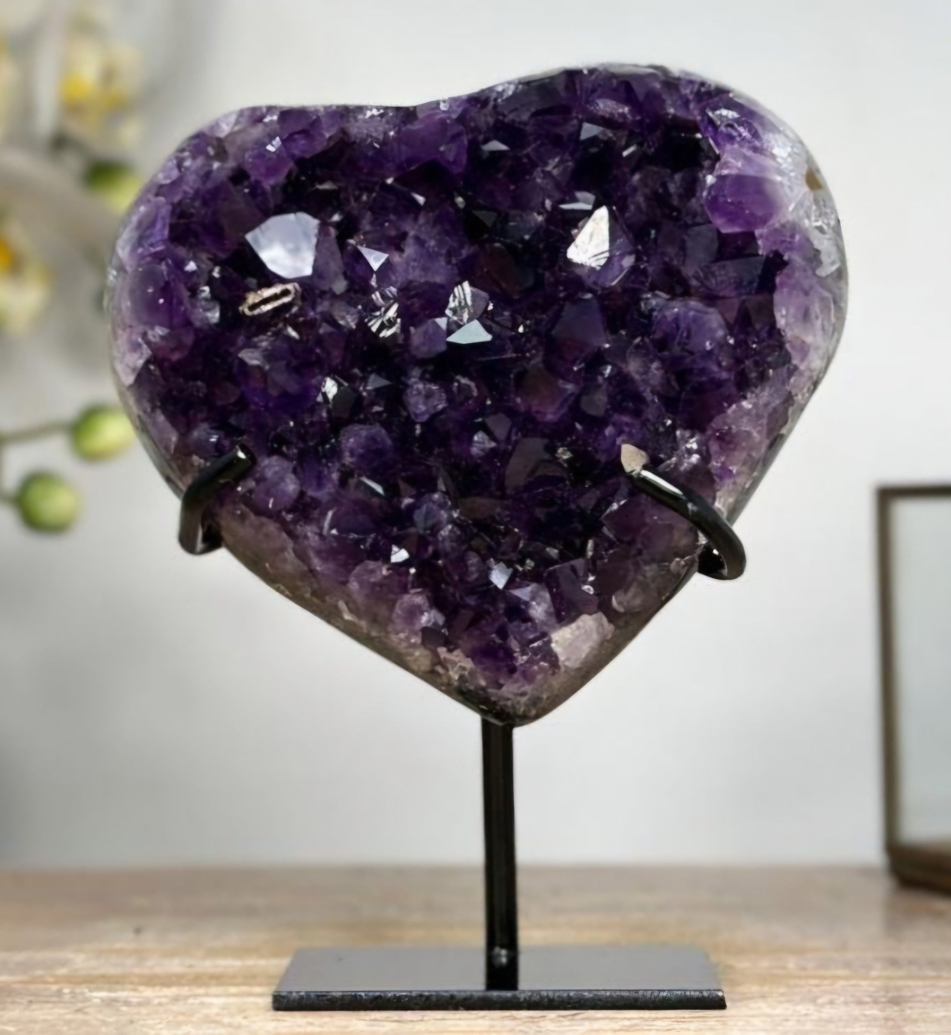 Discover the beauty of our hand-polished heart-shaped minerals, sourced from Uruguay, including Amethysts, Agates, and Quartz. Each piece is meticulously crafted and comes with a custom-made metal stand, adding a touch of elegance to any space.