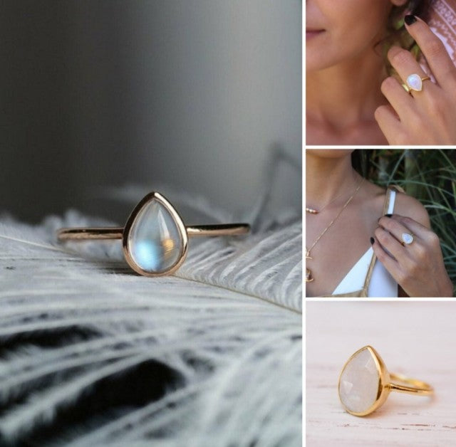 Vakker, enkel og håndlaget designring med liten månesten i 18K Rosegull plated ( 8x6mm) dråpeform.. Leveres også i ren 925s sølv og 18K gullplated..
