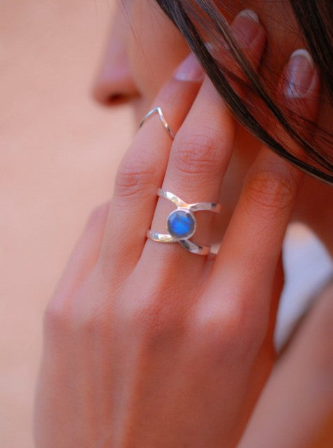 Vakker, enkel og hÅndlaget " Double Band " Designring i 925s sølv med liten rund sten i Labradorit